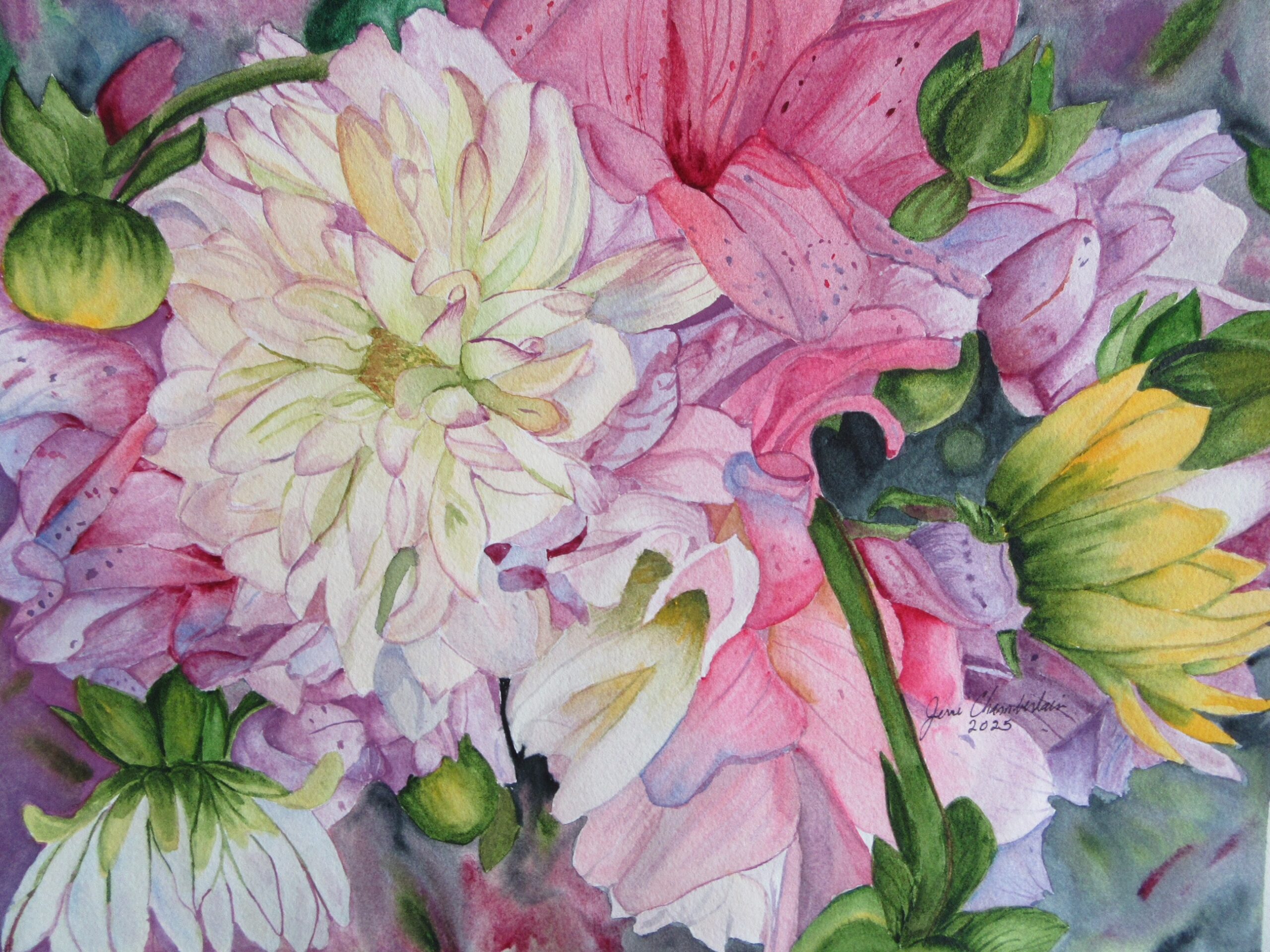 “My work transforms the relatively short life of a bloom into a lasting narrative of memory. As a child I gathered wildflowers and imagined their petals as silken ball gowns, and that sense of play informs how I approach my artwork. I don’t just paint flowers; I paint the memories they evoke. I am drawn to the fleeting magical beauty of blooms. The transparency and fluidity of watercolor makes it ideal for capturing the subtle gradients of petals, leaves and stems, and it is these qualities that create the aura for organic and vibrant florals. Through this series of floral paintings I want to share the beauty of flowers, and my fond memories of them, with others.”
