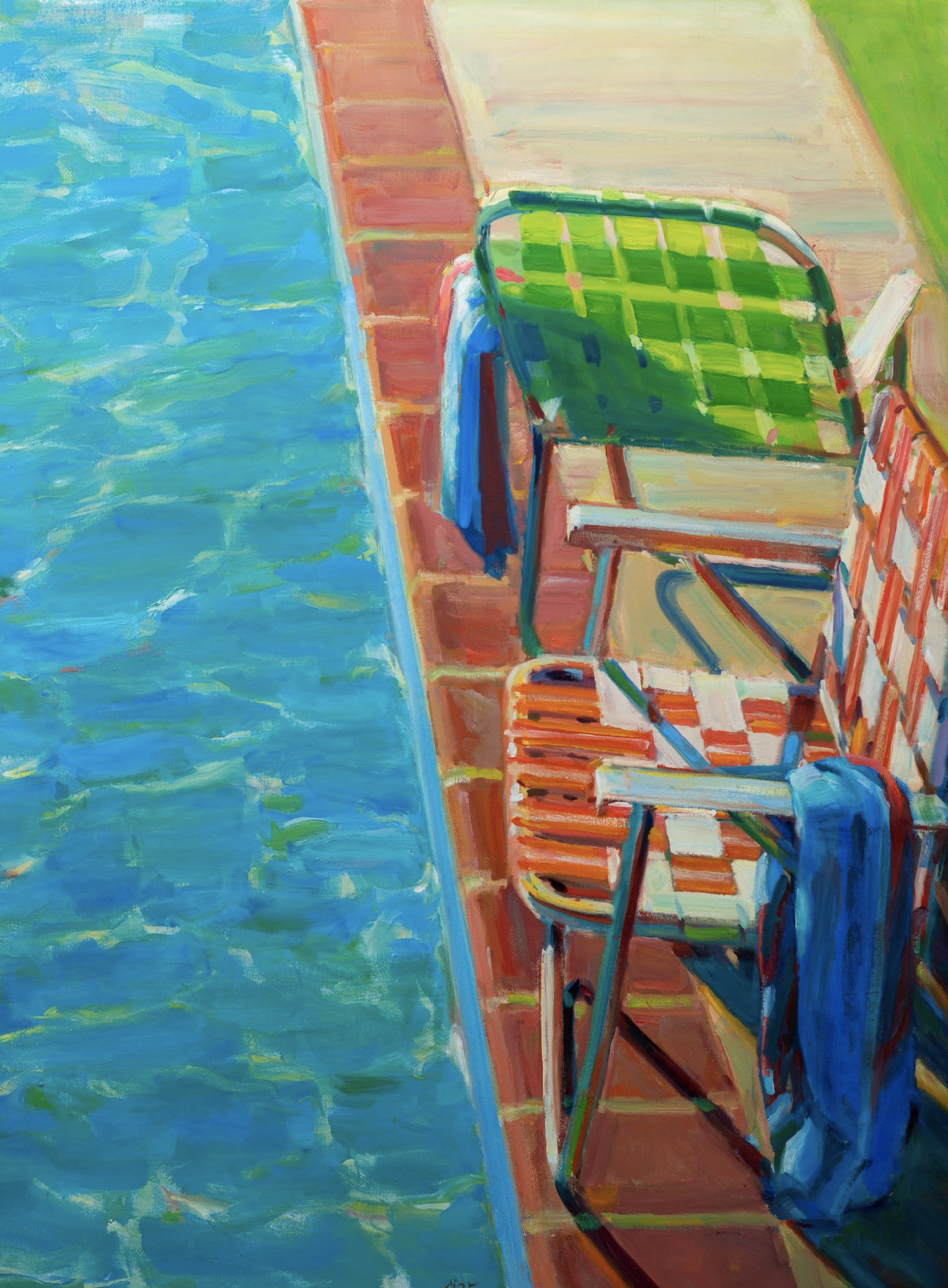 “I’m drawn to mid-century suburban subject matter as a pretext for telling stories. What I find in these backyards of manicured lawns and azure pools is a beautiful kind of melancholy. The families that settled these wide open spaces are long departed. The chairs lie empty. The rituals are lost to us. What remains is the poetry of absence.”