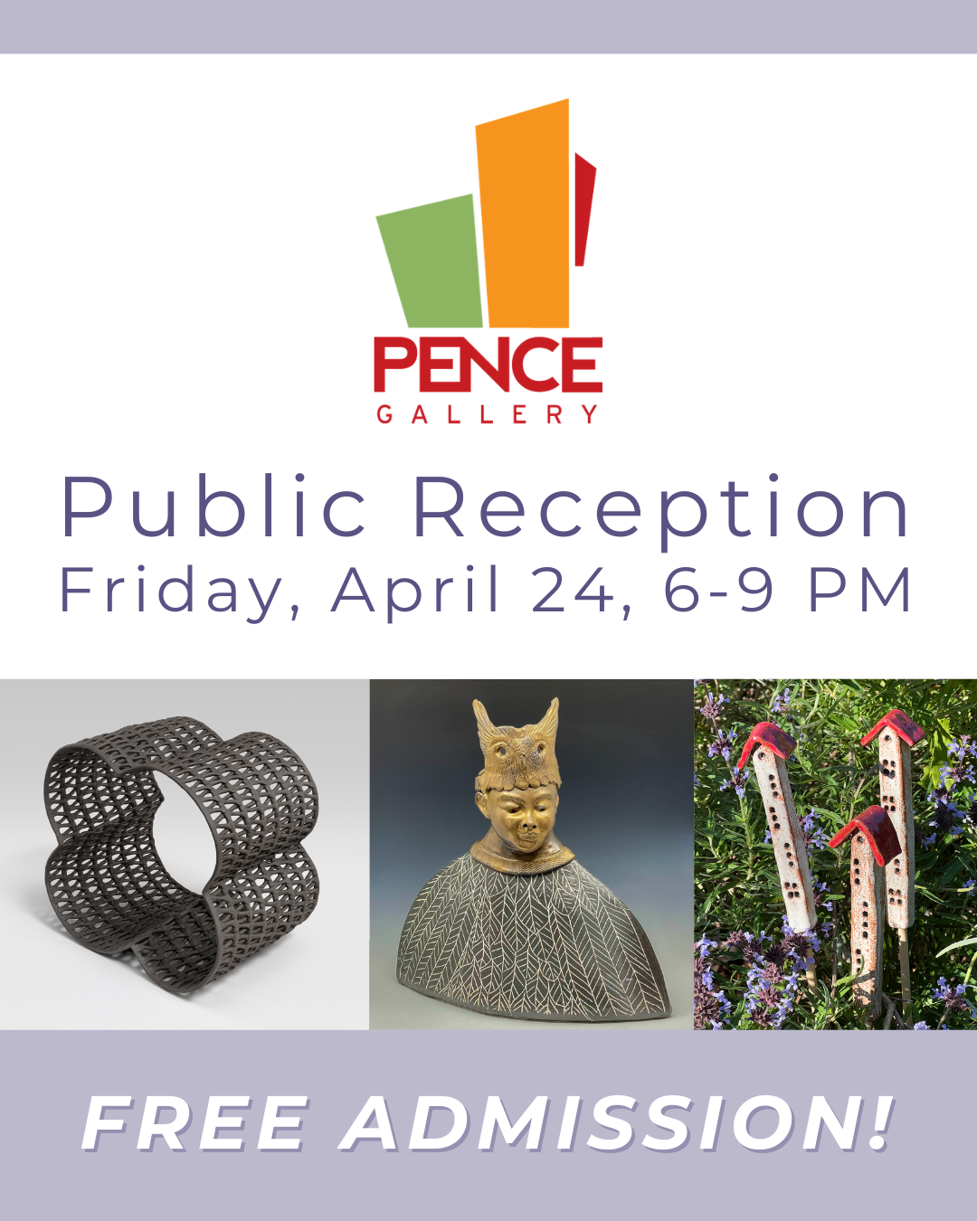 We invite you to join us at the Pence Gallery for a free public reception on April 24, 6-9 PM. We will be open in conjunction with the 2026 California Conference for the Advancement of Ceramic Arts (CCACA). Visitors can enjoy browsing our art exhibits, complimentary wine, and shopping in the Garden Art Sale.
