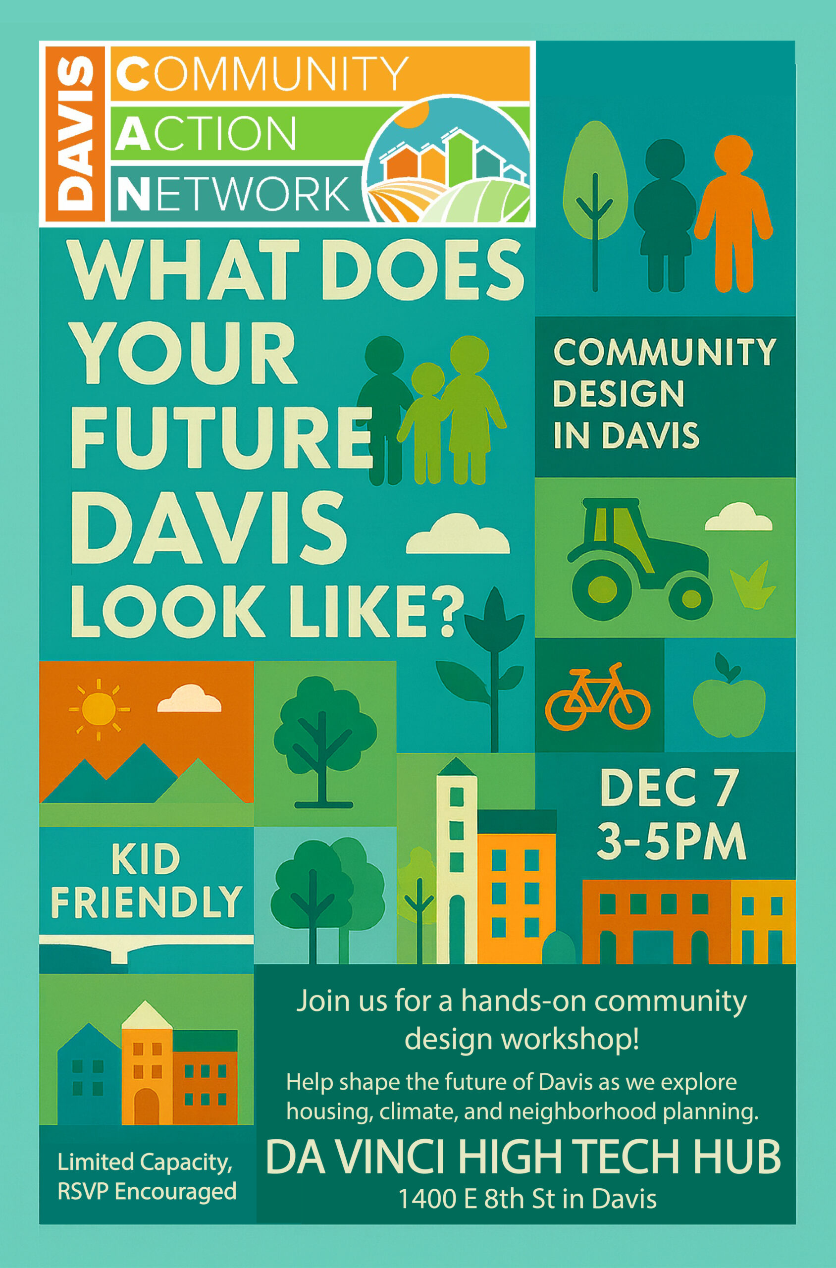 Join us for a hands-on workshop focused on community design. We will be engaging on a range of planning topics that come together to shape neighborhoods. We would like to know– what does your future Davis look like? By the end of the event, we hope you walk away informed and engaged on housing and climate issues!