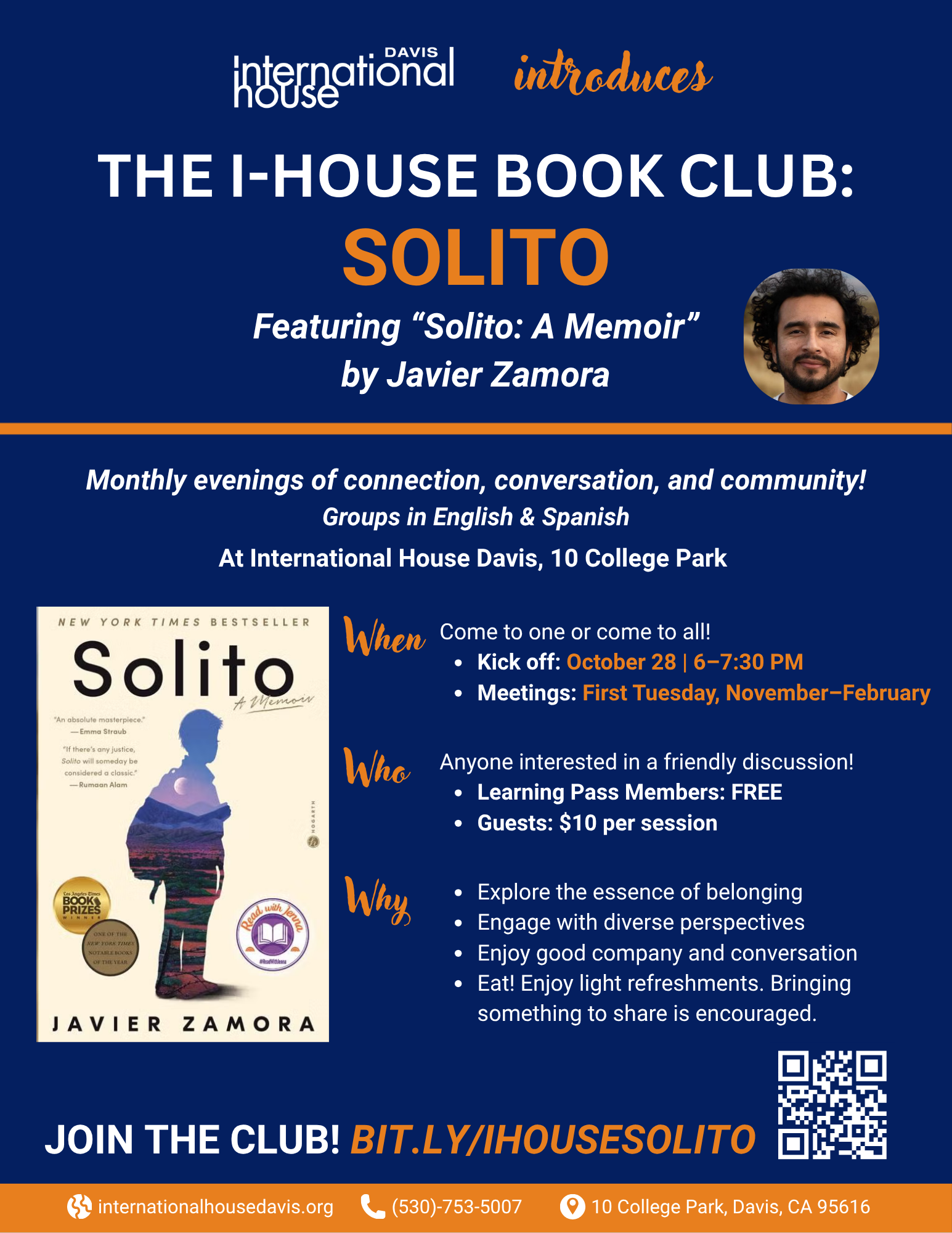 INTERNATIONAL HOUSE DAVIS. Join us for the I-House Book Club with groups in English and Spanish, featuring "Solito: A Memoir" by Javier Zamora. Facilitated by volunteers, this gathering offers an evening of meaningful connection, engaging discussion, and shared perspectives in great company. 6p—7:30p. $10