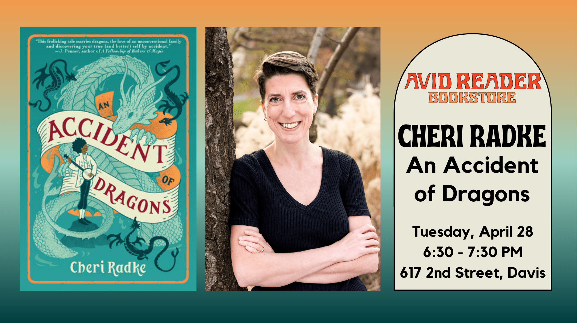 THE AVID READER. Join us for an evening to hear about Cheri Radke's debut novel, An Accident of Dragons. Radke has been a librarian, a bookseller, and an academic coordinator. She studied Linguistics at New York University and went on to earn a Masters in Library and Information Science from Kent State University. She lives in Woodland. 6:30p—7:30p. Free