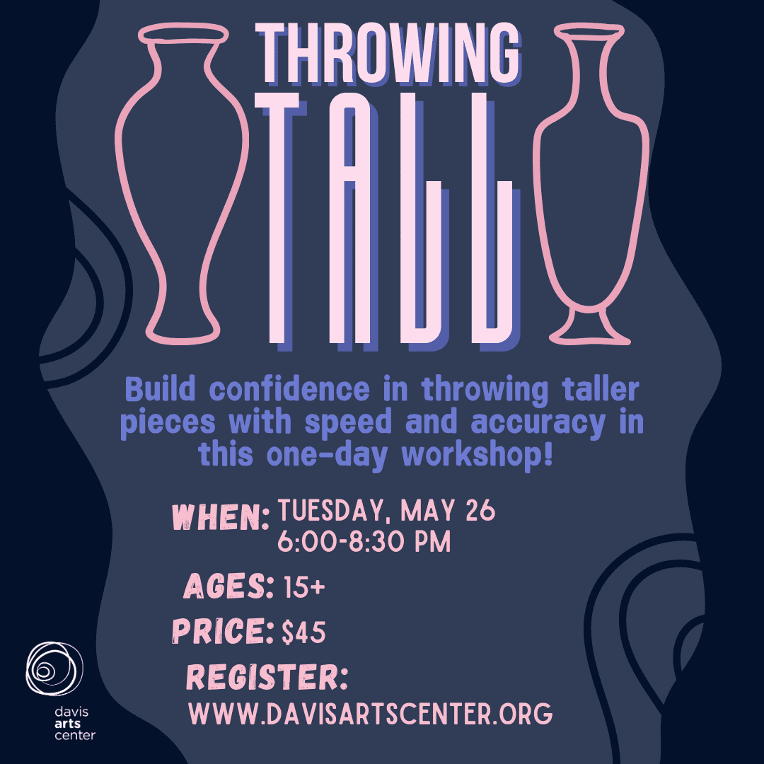 DAVIS ARTS CENTER. Elevate your throwing skills in this one-day workshop and learn to throw tall! The goal of the workshop is to help your throwing practice and build confidence in throwing taller pieces with speed and accuracy. No prior experience needed! For ages 15+. 6p—8:30p. $45