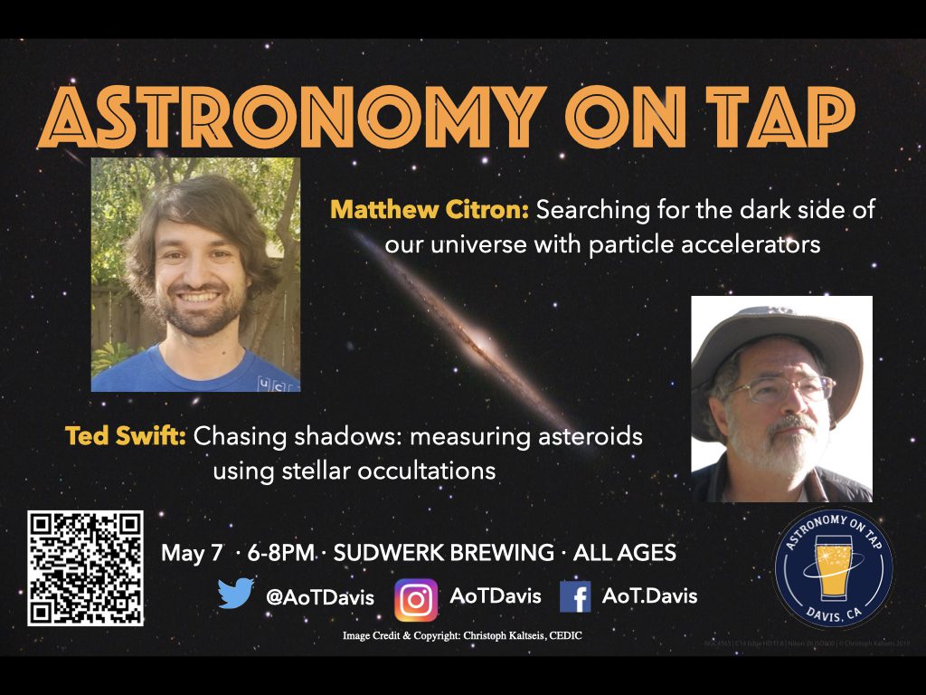 SUDWERK BREWING CO. Matthew Citron will talk about “Searching for the dark side of our universe with particle accelerators” and Ted Swift will speak about “Chasing shadows: measuring asteroids using stellar occultations.” As always we will also have astronomy in the news, trivia, and a raffle. Free and open to all ages. 6p—8p. Free