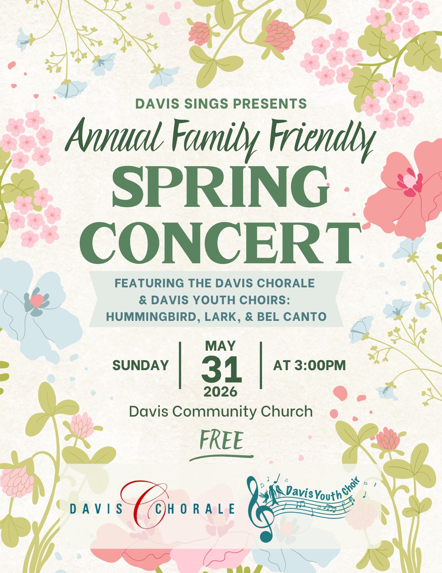 DAVIS COMMUNITY CHURCH. Join Davis Chorale and Davis Youth Choir (Hummingbird, Lark, and Bel Canto choirs) for Davis Sings annual family-friendly spring concert! Singers of all ages join together in a fun revue of the season. Donations gratefully accepted. 3p—5p. Free