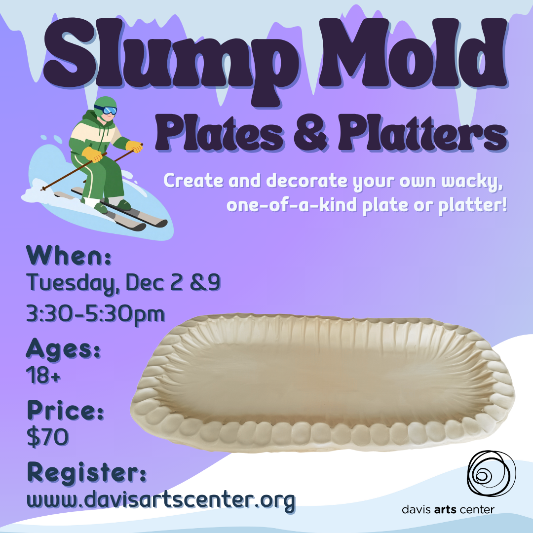 DAVIS ARTS CENTER. Create and decorate your own wacky, one-of-a-kind plate or platter! In this two-day workshop, students will learn how to roll a clay slab and drape it over a form to create a custom slump mold shape. After shaping their piece, students will finish it with a colorful glaze of their choice, making it both functional and food-safe. 3:30p—5:30p. $70