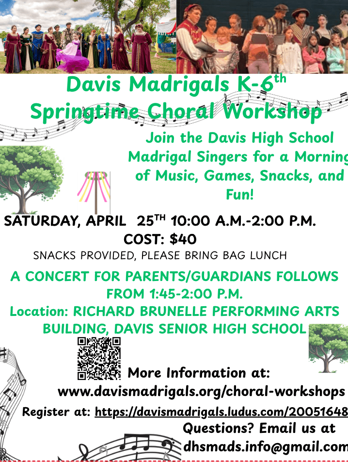 Davis Madrigals K-6th Springtime Choral Workshop Apr 25 Davis Madrigals K-6th Springtime Choral Workshop 10:00 am - 2:00 pm $40.00
