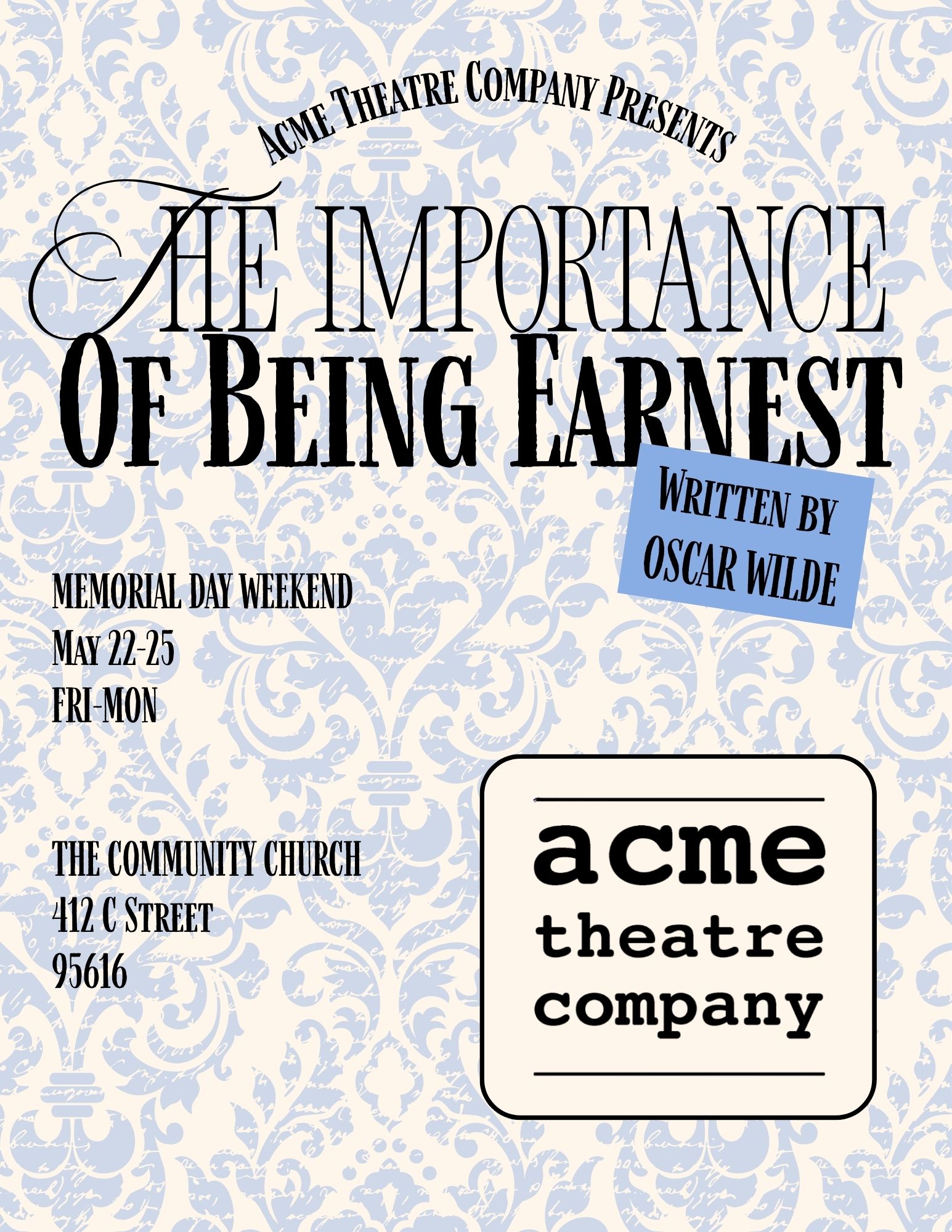 Acme Theatre Company Presents The Importance of Being Earnest May 23 Acme Theatre Company Presents The Importance of Being Earnest 7:00 pm - 9:00 pm Free