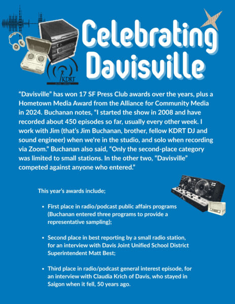 Longtime KDRT public affairs host Bill Buchanan won three awards for “Davisville” at the 48th San Francisco Press Club annual awards this week.