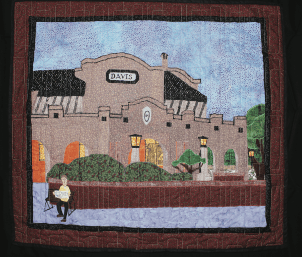 She put this into practice when creating the 20 one-of-a-kind quilts that make up her first-ever art show, opening in Davis on April 26 at the Davis Arts Center. The quilts recreate classic Davis landmarks from the Farmers Market, to the Arboretum, to the Compassion Bench on the corner of 3rd and C.