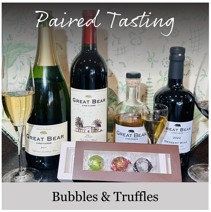 GREAT BEAR VINEYARDS. It’s time to treat yourself! Join us for a deliciously indulgent afternoon with a flight of 4 wines with 4 chocolate pairings. 12p—5p. $30