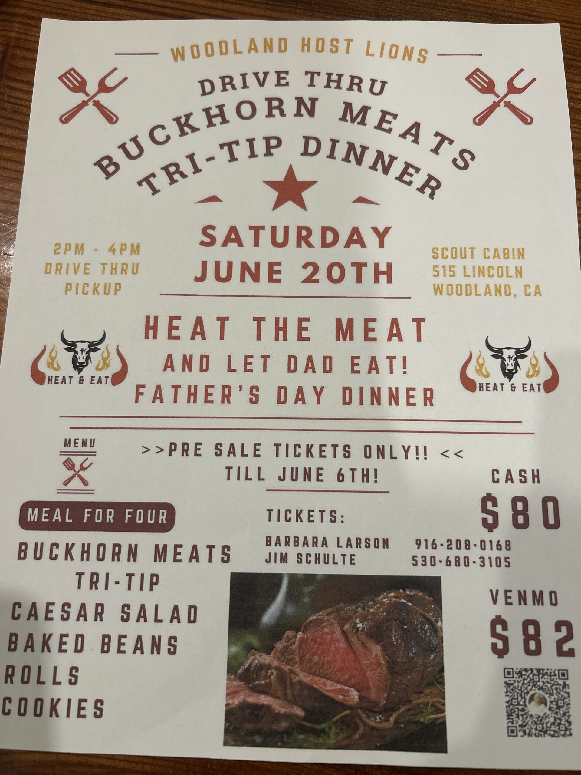 SCOUTS CABIN, WOODLAND. Enjoy a Father’s Day dinner brought to you by Woodland Host Lions. Complete dinner for 4 including Buckhorn meat, salad, beans, rolls, and cookies. Drive thru pick up at Scouts Cabin. Pre-sale tickets only through June 6; accepting cash or Venmo. 2p—4p. $80—82